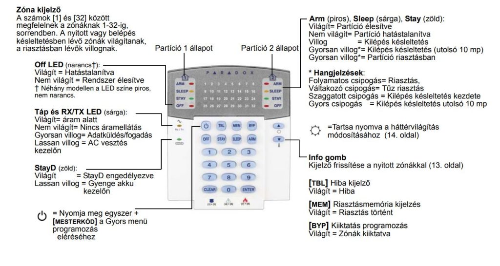 A PARADOX K32+ ledes kezelőegység. Fontos! Ha nem ismered a riasztórendszer ki/bekapcsoló kódját, akkor csak a [TBL] és a [CLEAR] gombokat javasolt használni a véletlen beélesítés elkerülése érdekében.