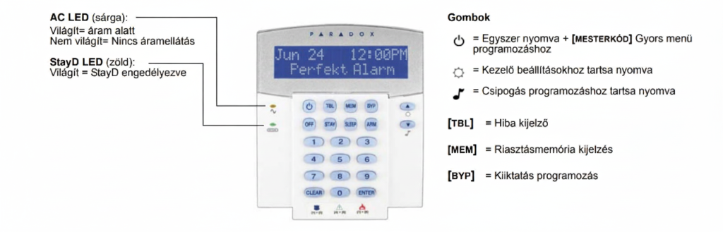 A PARADOX K32LCD+ szöveges LCD kijelzős kezelőegység. Fontos! Ha nem ismered a riasztórendszer ki/bekapcsoló kódját, akkor csak a [TBL] és a [CLEAR] gombokat javasolt használni a véletlen beélesítés elkerülése érdekében.